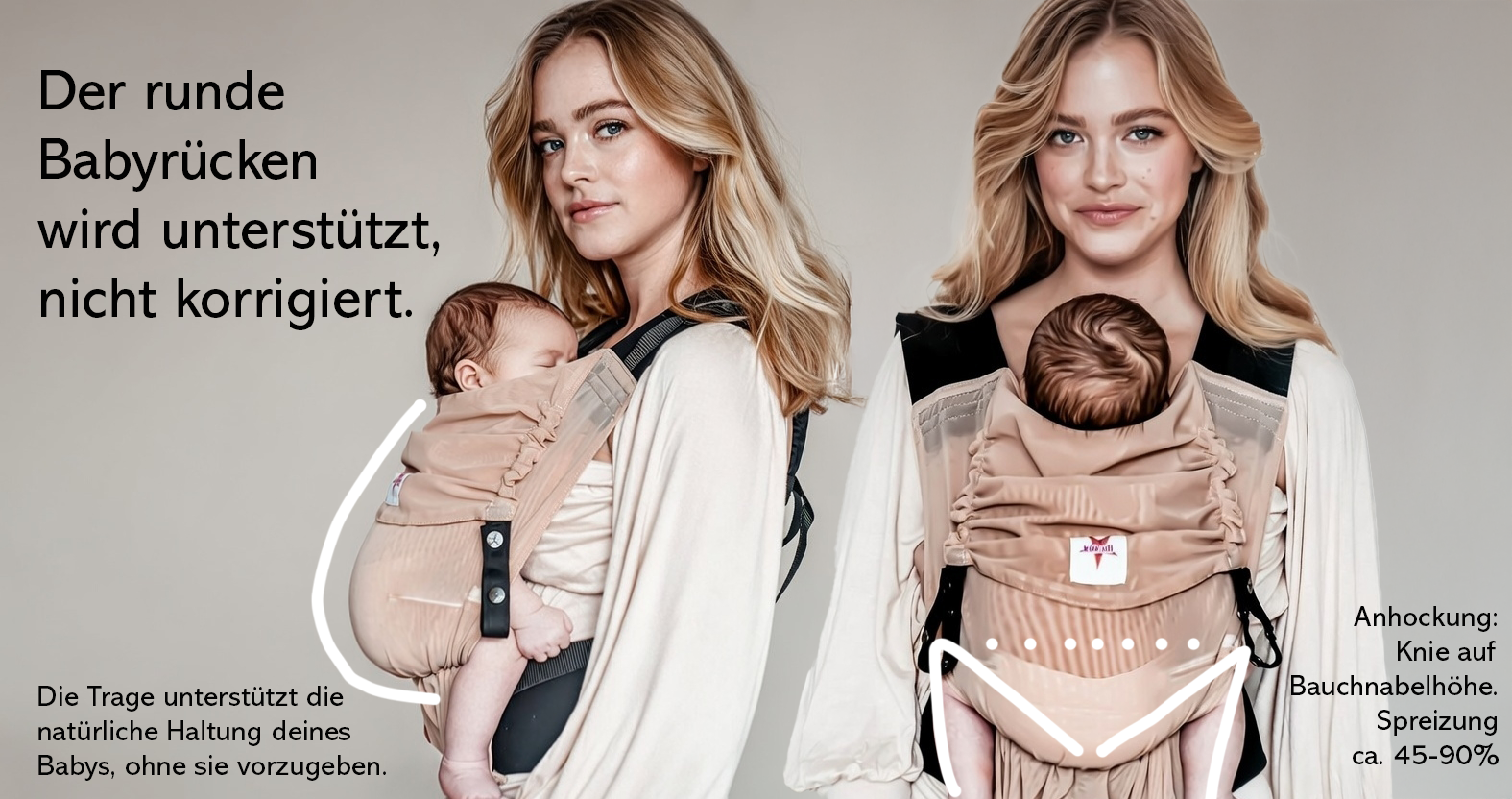 Körpernah, anschmiegsam, unterstützt den natürlichen runden Rücken des Babys. Gewichtsverteilung wie beim Tragetuch – spürbar entlastend.