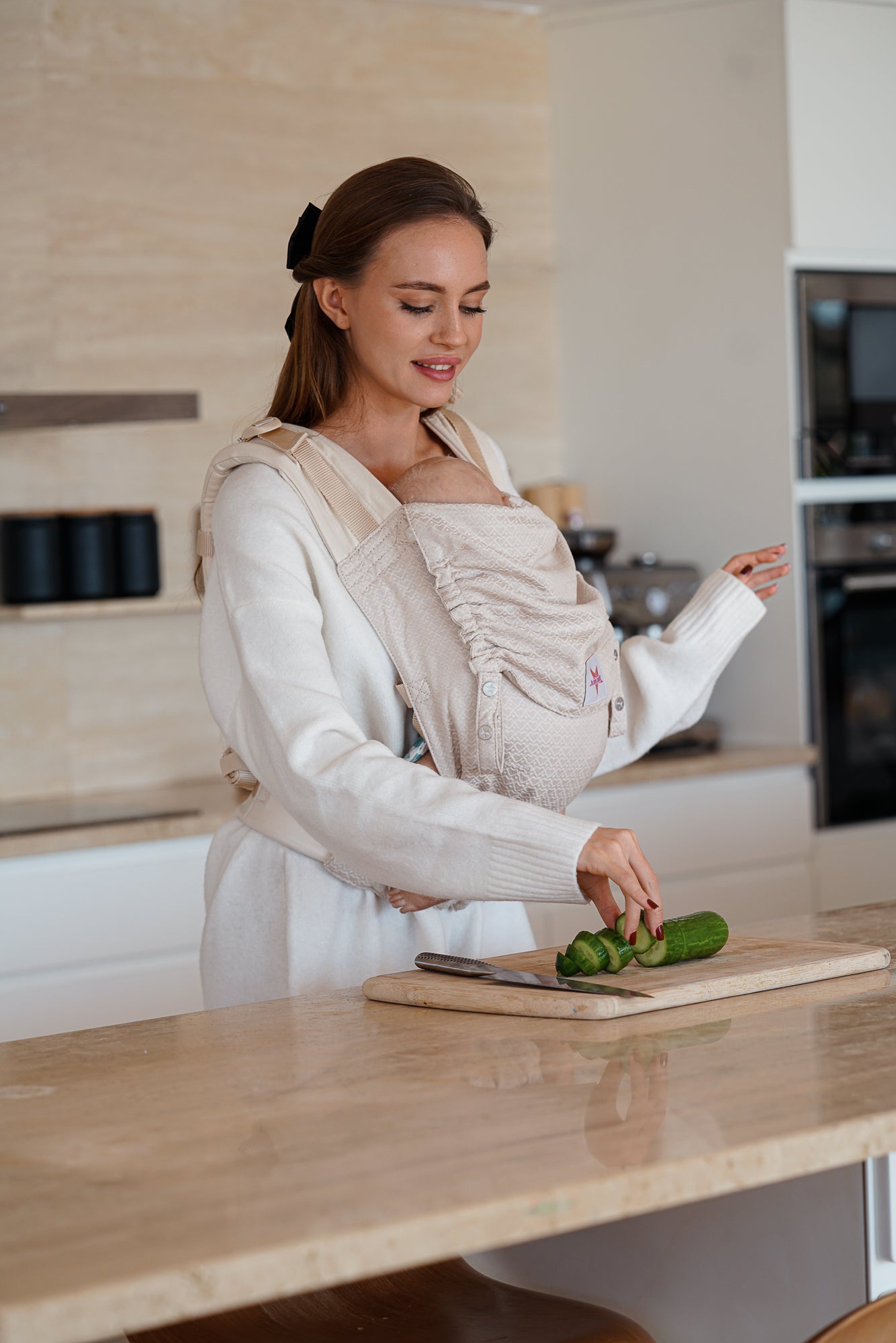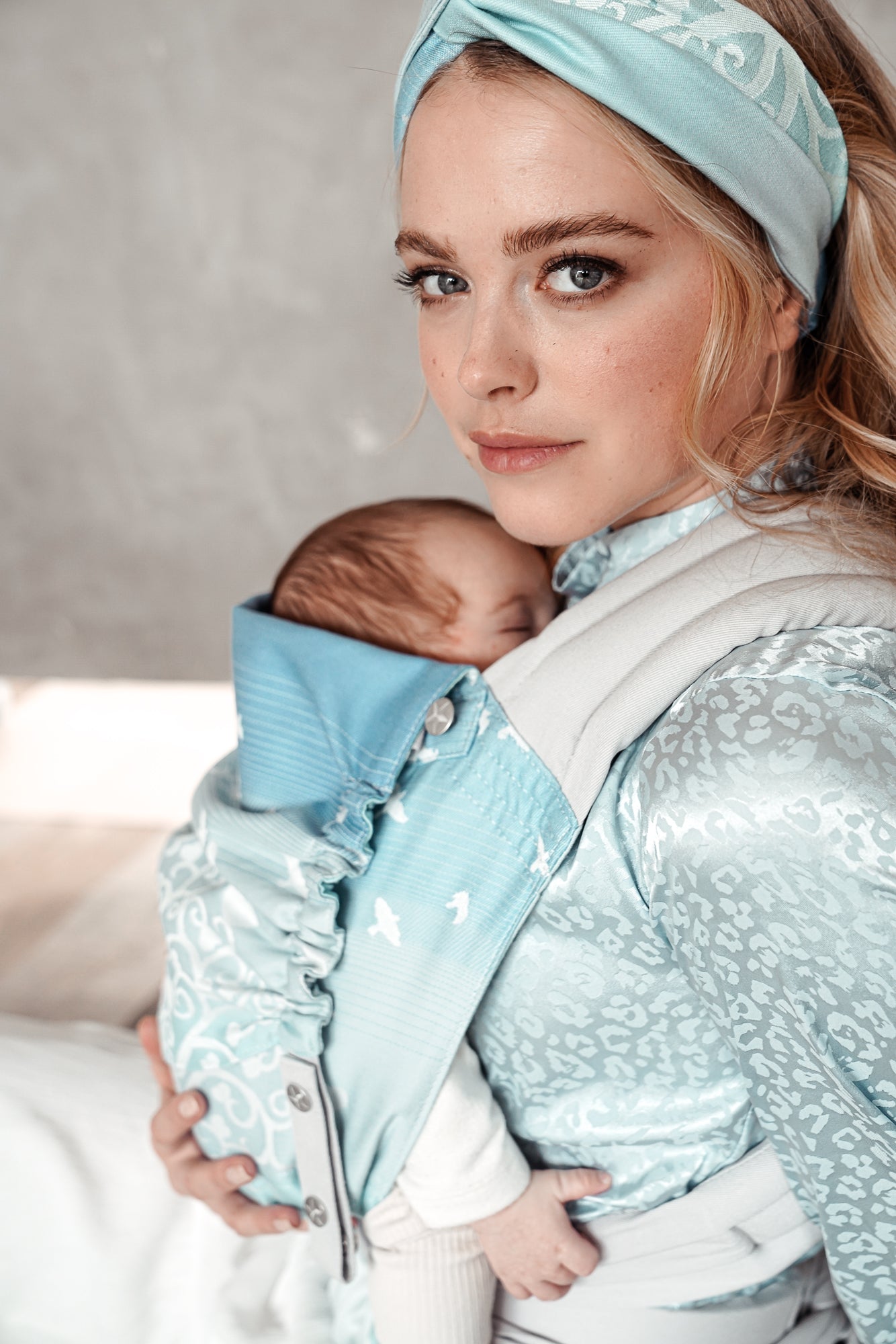 Der gewebte Tragetuchstoff schmiegt sich optimal an, stützt gleichmäßig und sorgt für ein körpernahes Tragegefühl – kombiniert mit einer durchdachten, schnellen Handhabung ohne kompliziertes Binden.