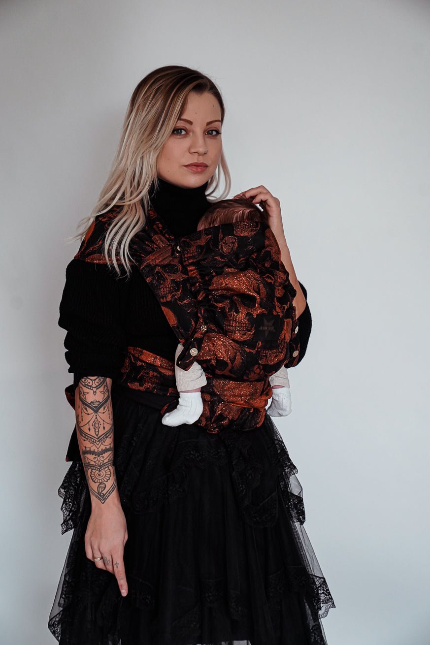 Der KOKADI WrapStar Skulls x Florian ist für Eltern gemacht, die Freiheit lieben – und dennoch Nähe suchen. Tiefschwarze Eleganz trifft auf kupferfarben schimmernde Totenköpfe, die sich wie flüssiges Licht über den Stoff legen. Dieses Design ist kein Accessoire, sondern Ausdruck einer inneren Haltung: stark, eigenständig, unerschrocken und dabei von zeitloser Schönheit.