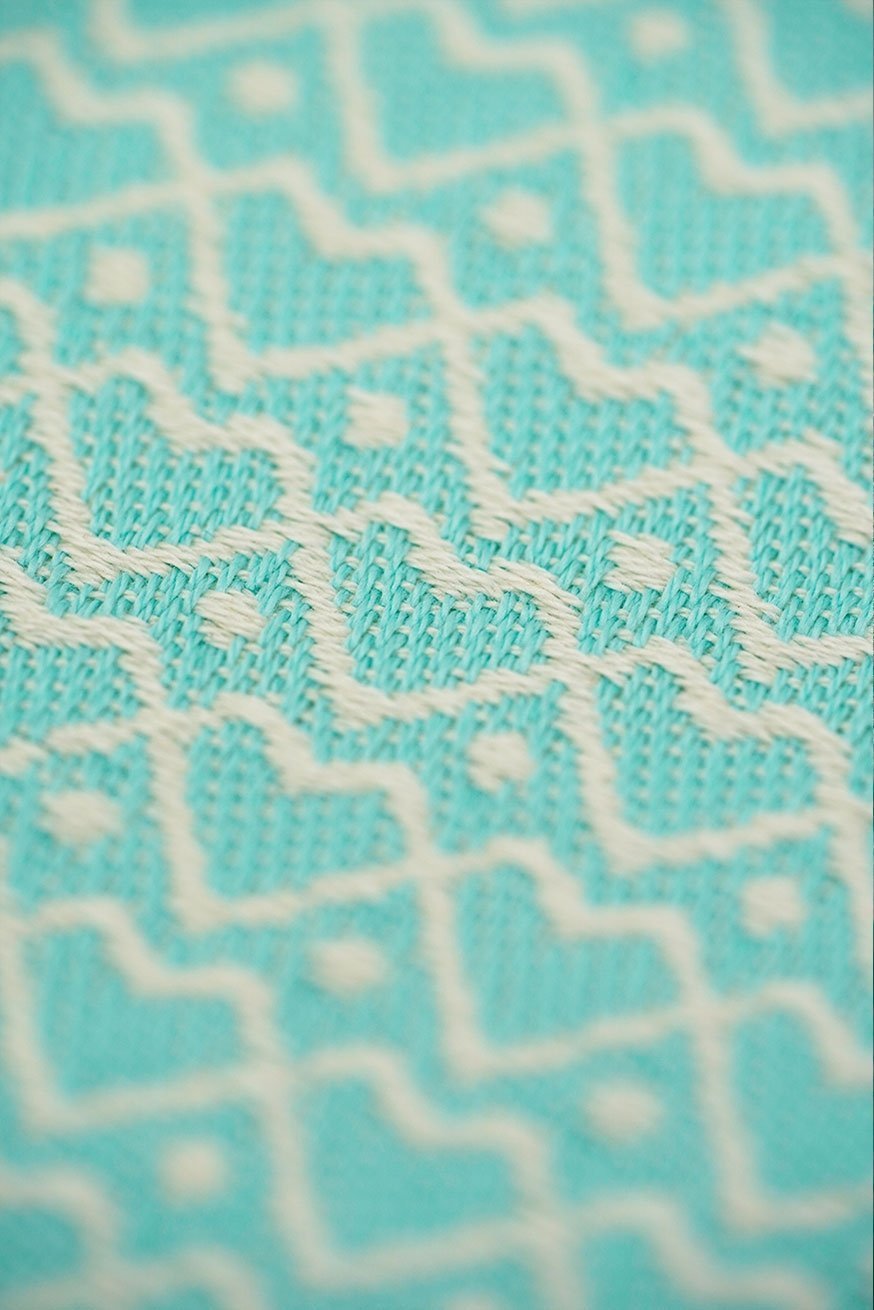 Het hartpatroon is rechtstreeks in het doek geweven van 100% hoogwaardig biologisch katoen en geeft de stof een unieke structuur. Met een gebiedsgewicht van slechts 200 g/m² is de draagstof ongelooflijk licht en tegelijkertijd zo stabiel dat zowel pasgeborenen als grotere dragers ermee kunnen worden gedragen.