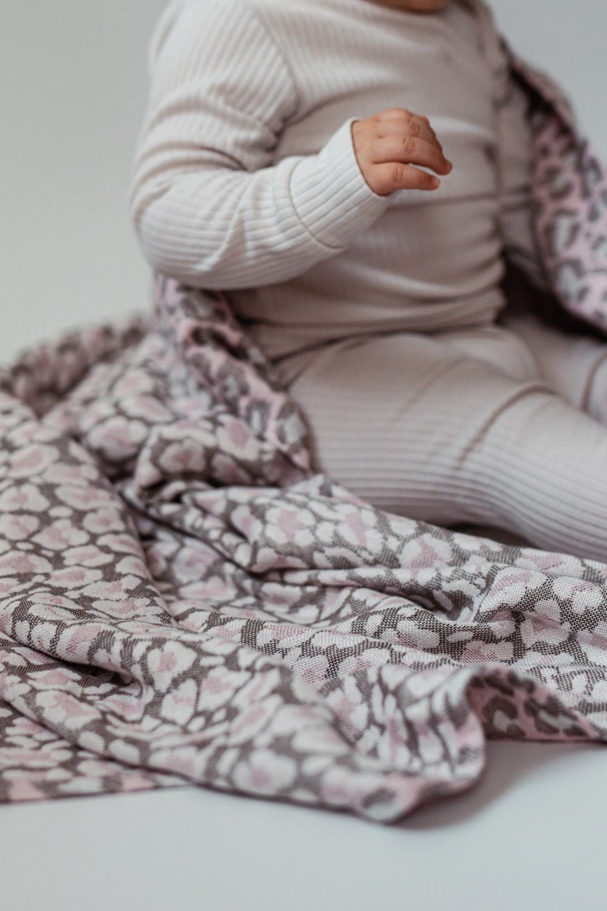 Het safaridessin op delicaat roze zorgt voor een vleugje wildernis en brengt tegelijkertijd elegantie. Het knuffeldekentje is in twee lagen geweven van 100% bamboeviscose, waardoor hij ideaal is voor warme zomerdagen.